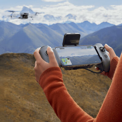 The included remote controller works with your smartphone and the Potensic Eve app to pilot the ATOM 2. The remote slides open to hold a phone in a landscape orientation with dimensions up to 6.7" long, 3.9" wide, and 0.5" thick. It also provides customizable features like a stick mode, two buttons, and stick sensitivity. With Potensic, Eve opened, in addition to a live drone view, telemetry, takeoff/landing button, and other basic piloting features, the app offers these additional features: